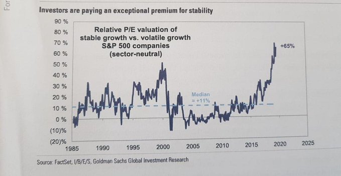 As global growth concerns escalate investors are rushing into low volatile stocks vs cyclicals. Valuation differential is now at 35 year high..bit similar to tech boom of late 90s!