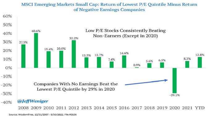 WisdomTree finds that 10% of the market value of the MSCI Emerging Markets Small Cap Index is in companies who have negative earnings.