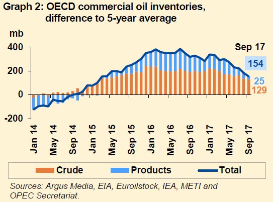 Global oil surplus stocks have fallen sharply this year, down 183 million barrels to 154 million above 5-year average, says OPEC in its monthly report