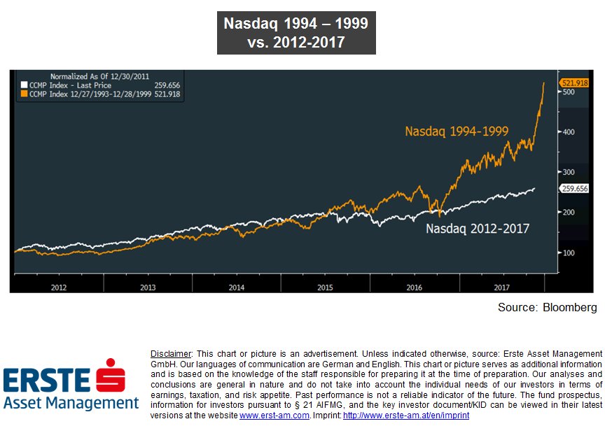 Performance of Nasdaq 1994 - 1999 compared with the current period 2012-2017 - twice as high before the bursting of the millenium bubble