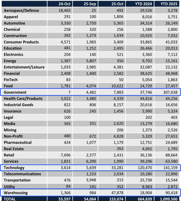 The top three areas for announced job cuts in 2025 so far have been government, tech and warehousing, per Challenger