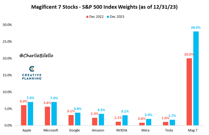The Magnificent Seven's weighting in the S&P 500 grew from 20% to 28% over the course of 2023, the largest share for any 7 companies in the index on record