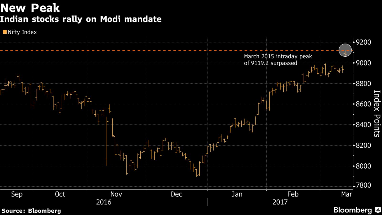Indian stocks rally to a record after PM Narendra Modi's victory in state elections