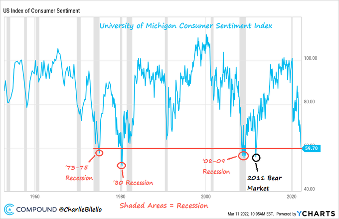 In the last 70 years, the only time US Consumer Sentiment