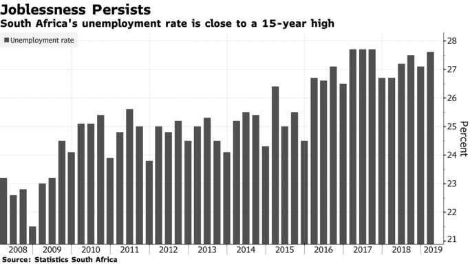 South Africa’s unemployment rate climbed in the first quarter of 2019 as construction and financial-services firms cut positions