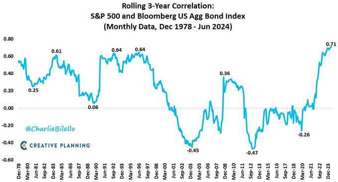 The correlation between US stocks and bonds over the last 3 years (0.71) is the highest on record