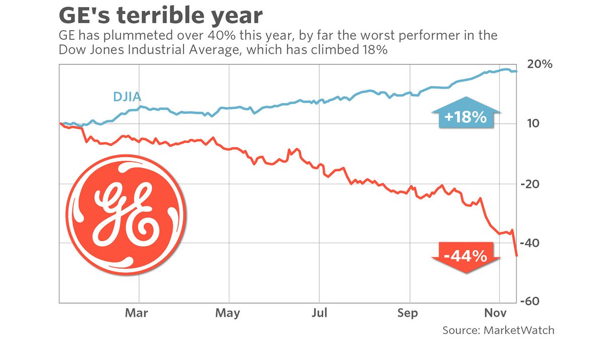 GE has plummeted 44% YTD, by far the worst performer in the DJIA