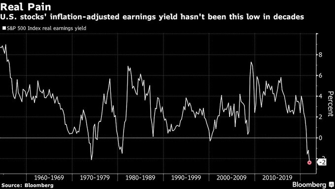 Real earnings yield for the S&P 500 Index hasn’t been so deep into negative territory since 1947, and this portends downside risks for stocks, acc to BoA. There have been only 4 historical instances of neg real earnings yield, all of which resulted in bear markets. (BBG)
