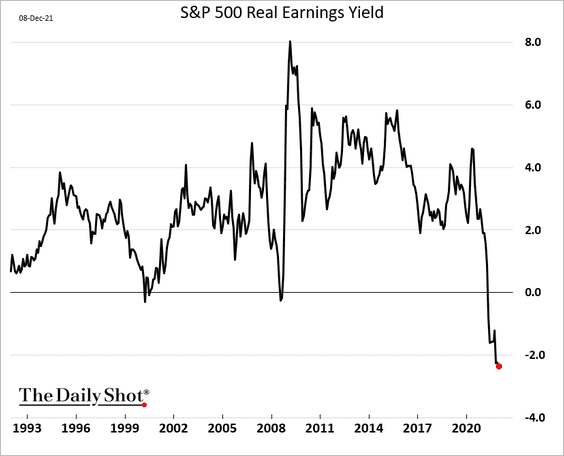 At the end of the day, the price you pay is the value you get (h/t Warren Buffett) The real earnings yield (inflation-adjusted inverse of P/E ratio) is extremely negative. 2000 and 2008 are worth noting