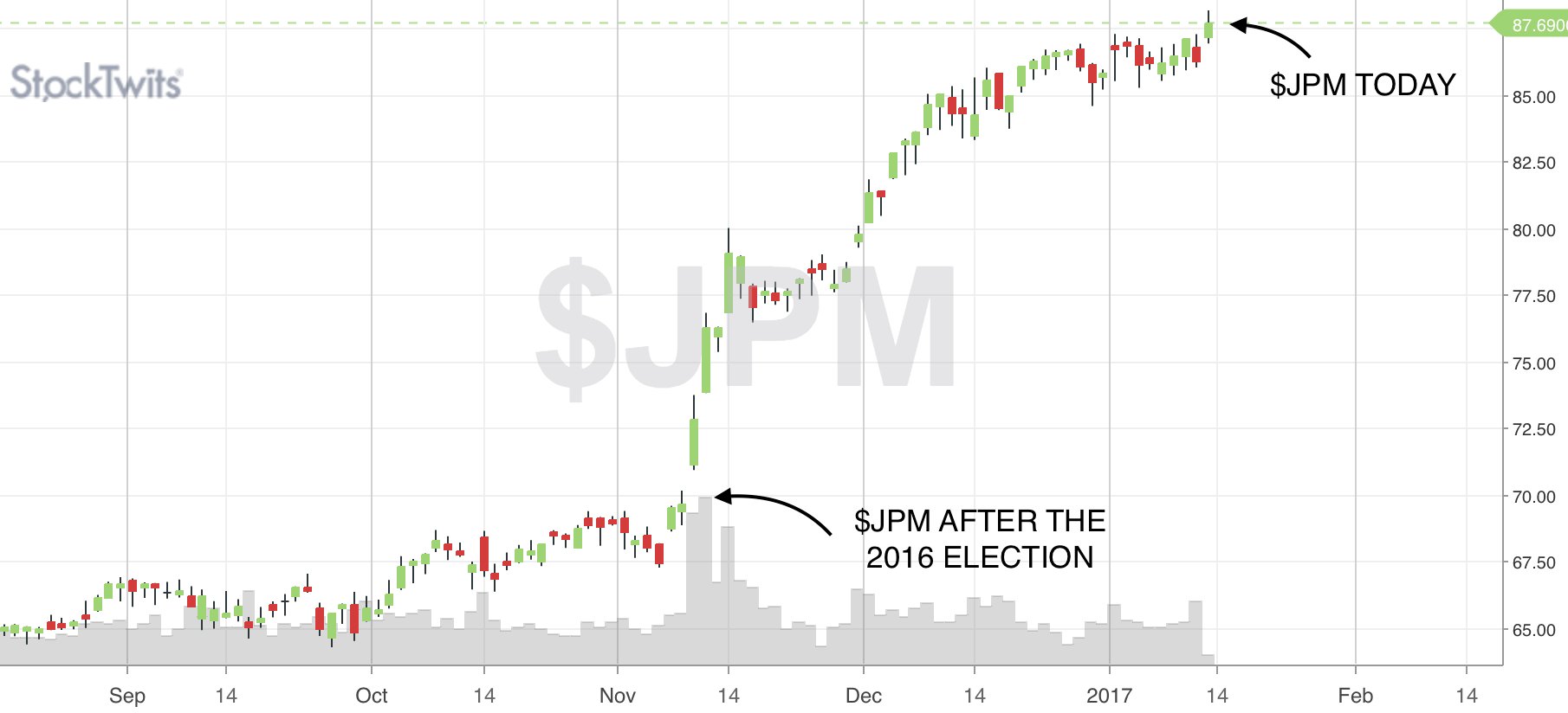 JP Morgan just hit $88.17 per share. A new all-time high. It's also up 30% since the election