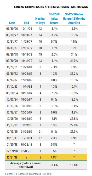Here are the previous shutdowns. Worth noting stocks tend to do well 12 months after the shutdown ends