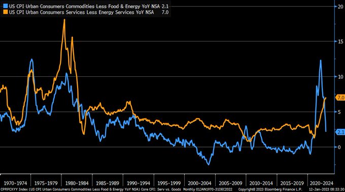 Core goods CPI seeing rapid disinflation (blue) while core services (orange) is taking longer to roll over (actually moved higher y/y in December)