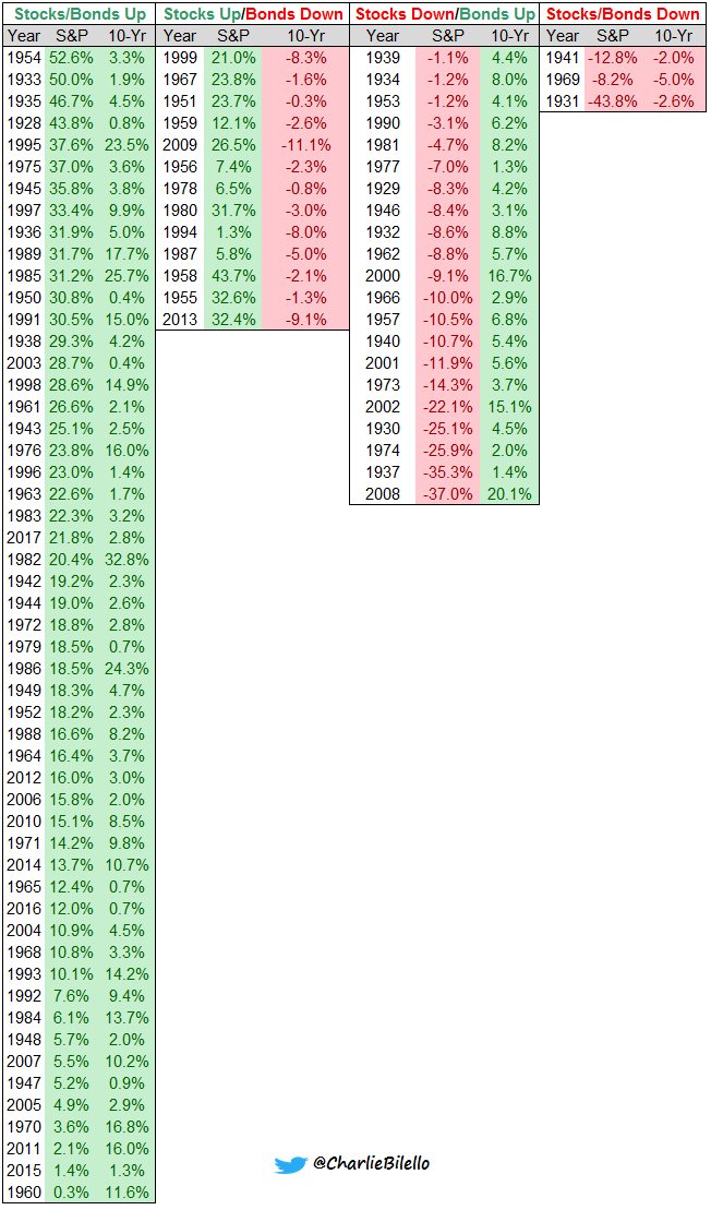 Since 1928... Stocks/Bonds Up: 59% of time. Stocks Up/Bonds Down: 14% of time. Stocks Down/Bonds Up: 23% of time. Stocks/Bonds Down: 3% of time