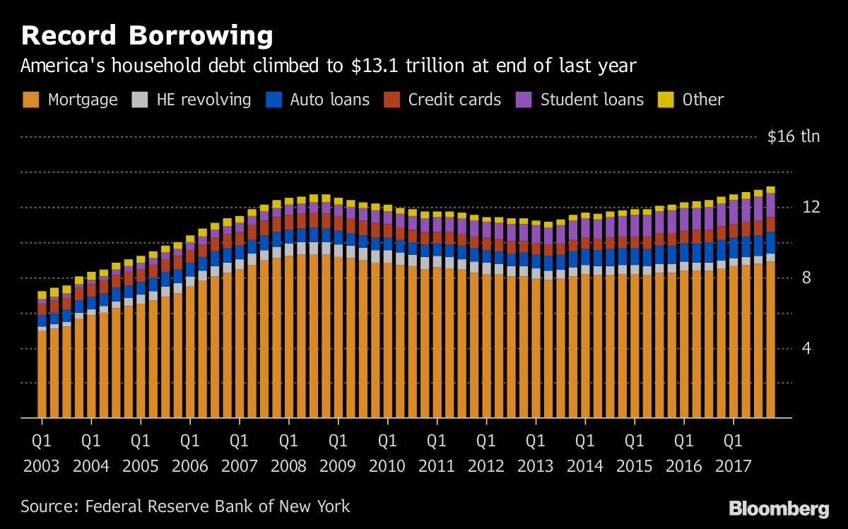 Household debt in America is now at $13.1 trillion. That's a record. This Bloomberg chart shows where most of the debt is.