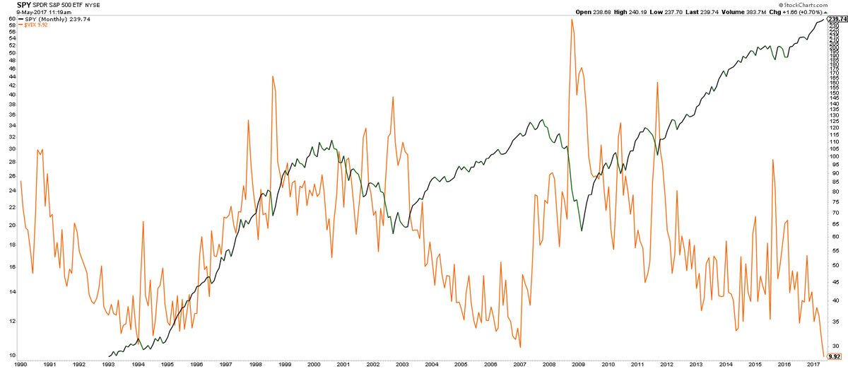 The VIX (orange line) has never been lower. The S&P 500 (dark line) has never been higher