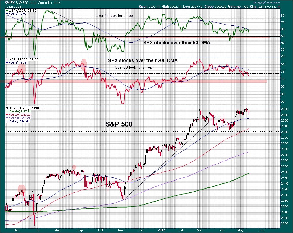 The S&P 500 & the amount of stocks over their 50 & 200 DMA in the S&P 500. Both are pointing down and under the 50 DMA