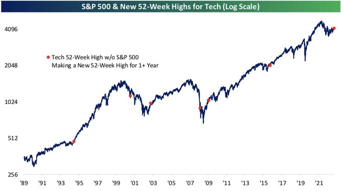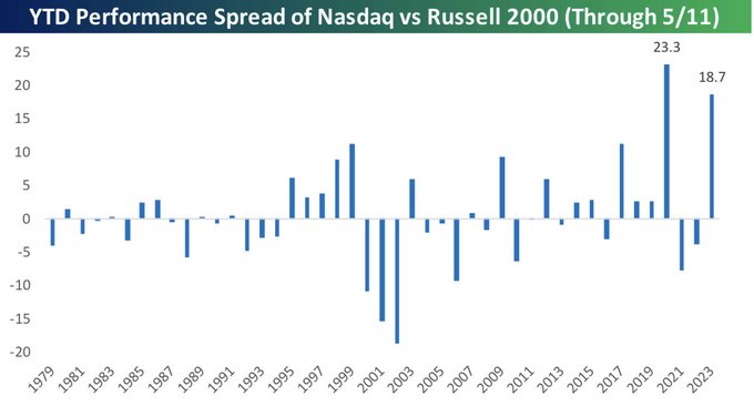 The Tech-heavy Nasdaq is outperforming the small-cap Russell