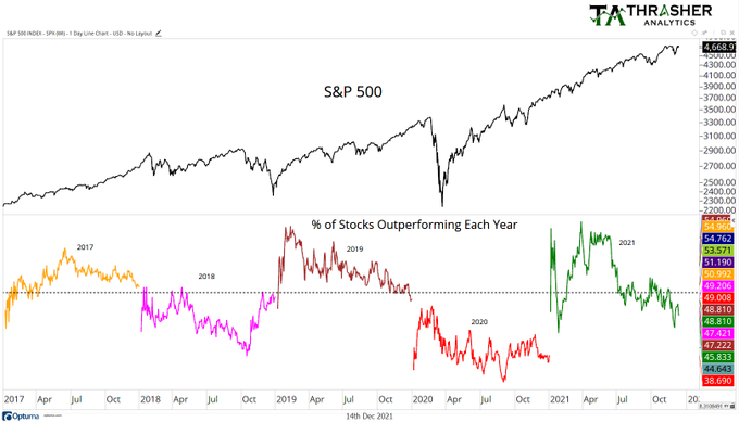 Just 10 stocks account for 40% of the YTD gain in the S&P 500 with less than half the market keeping up with the index.