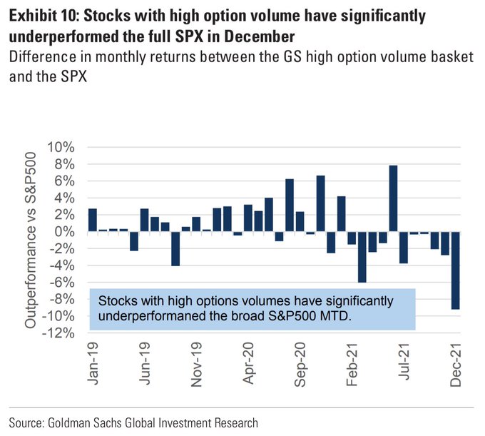 Stocks with high option volume have significantly underperformed the full SPX in DecemberDown pointing backhand index