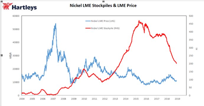 Nickel prices still at relatively low levels given big drawdown in LME nickel stocks in the past 12 months