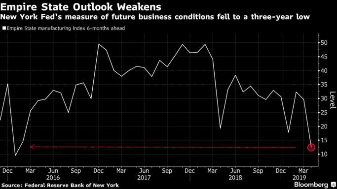 The Empire State survey of expectations six months ahead fell to the lowest level in more than three years