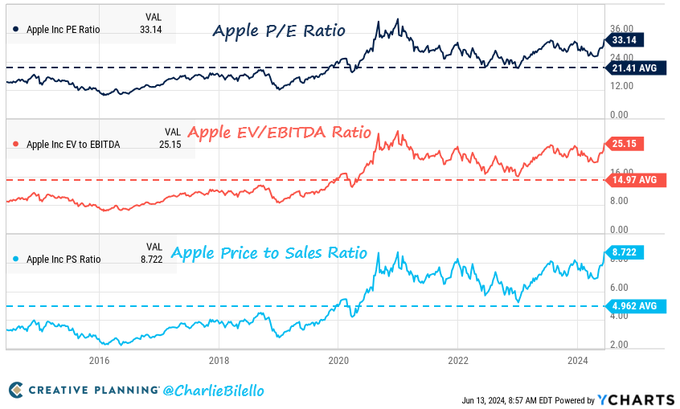 Apple's P/E Ratio: 33x 10-year average: 21x Apple's EV/EBITDA