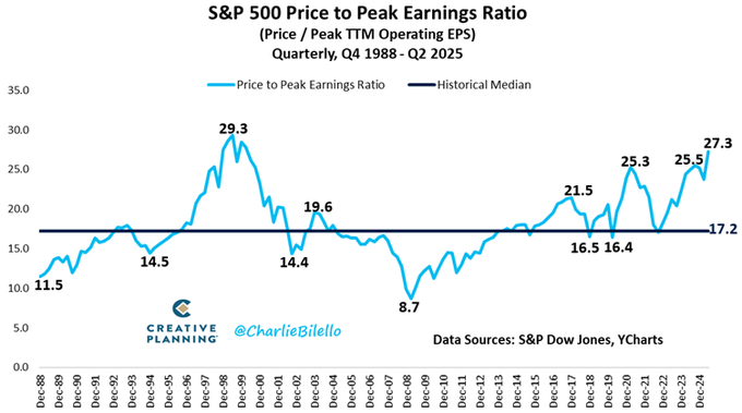 The S&P 500's price to peak earnings ratio has moved up to 27.3, its highest level since 2000 and 59% above the historical median