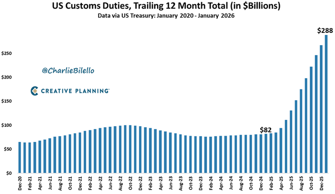 The US collected a record $288 billion in customs duties over the last 12 months, which was over 3x higher than what was collected in the 12 months prior ($82 billion)