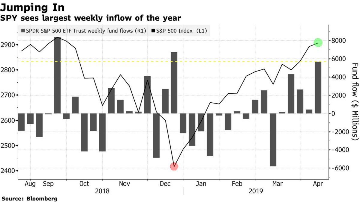 'Investors poured more than $5.6 billion into the SPDR S&P 500 ETF Trust, known as SPY, last week. The last time the world’s largest ETF saw inflows of this magnitude, U.S. stocks were on the cusp of a bear market in late 2018.'