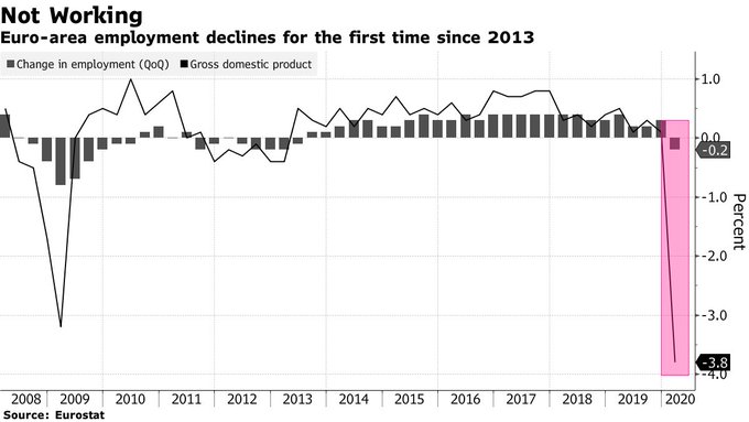 Employment in the euro area declined 0.2% in the three months through March, the first decline since 2013