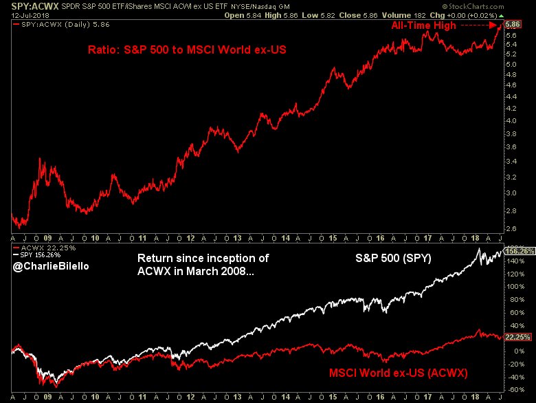 Ratio of US stocks to non-US stocks hits another all-time high. Huge gap in performance over past 10+ yrs