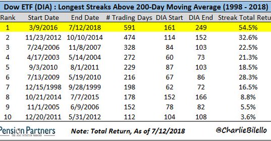 The Dow ETF DIA has not closed below its 200-day moving average since March 2016
