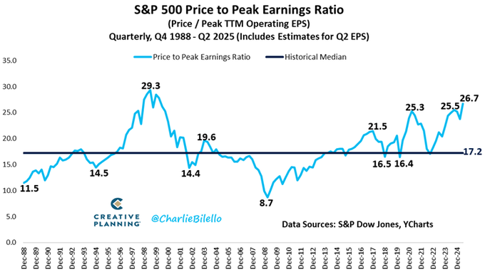 S&P 500's price to peak earnings ratio has moved up to 26.7,