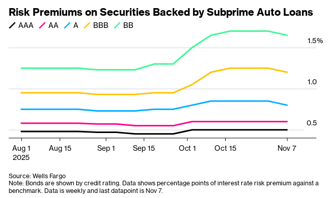 Missed payments on subprime auto loans are increasing risk premiums on subprime auto loans. But high quality borrowers aren't showing nearly the same level of strain.