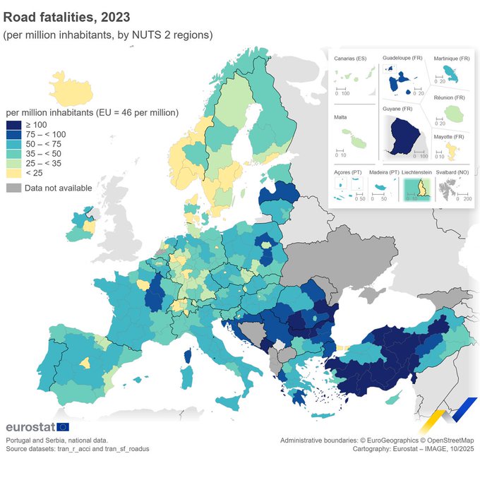 In 2023, the EU recorded 46 road fatalities per million inhabitants.