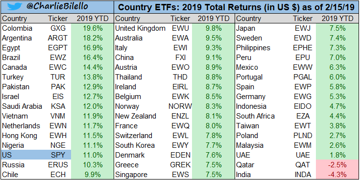 Global Equities: 46 out of 48 country ETFs are positive thus far in 2019 with an average return of +8.7%