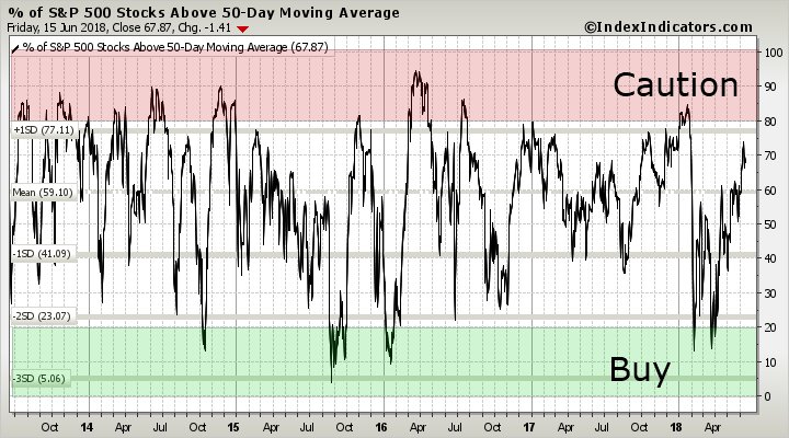 The percent of S&P 500 stocks above their 50-day simple moving average (SMA) begins the week at 67.87%