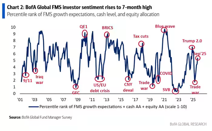 BofA's latest Global Fund Manager Survey is the most bullish since February, with long Mag 7 the most crowded trade for a second-straight month