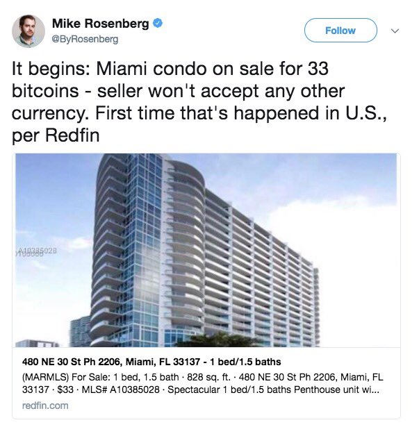 What would you rather have: 33 Bitcoins BTC.X Or this Miami condo