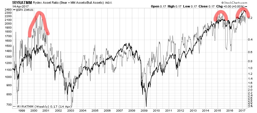 Rydex asset ratio (bear + mmkt relative to bull) today at even higher extremes than during the 2000 tech bubble mania