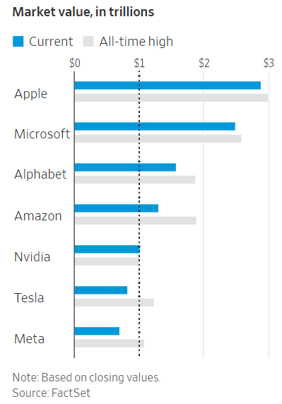 7 US companies have surpassed the $1 trillion market cap milestone at one point or another with Nvidia being the latest. Tesla and Meta both surpassed $1 trillion back in 2021 but have since fallen back, now trading at $822 billion and $703 billion respectively.