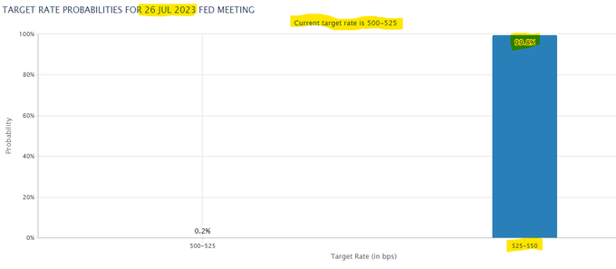 Probability of a Fed rate hike next week is approaching 100%. 25 bps increase to 5.25-5.50%. Done deal.