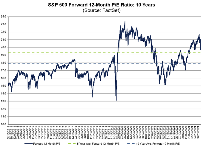 The forward 12-month P/E ratio for SPX of 21.0 is above the 5-year average (19.4) and above the 10-year average (17.9). earnings