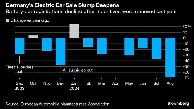 Germany, where electric vehicle (EV) sales plunged 69% during Aug YoY, totaling just over 27,000 vehicles. EVs now make up 14% of the market through Aug, down from over 15% in Aug 2023, disrupting automakers' plans to move away from combustion engines.