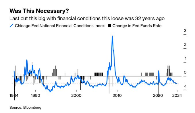 The last time the Fed cut this much with financial conditions as loose as they are now was 32 years ago