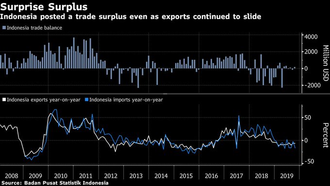 Indonesia posts a surprise trade surplus even as exports contract for a 12th straight month