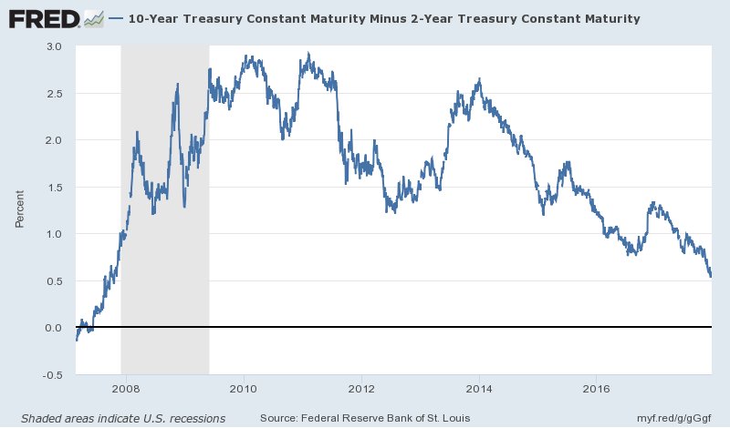 One of the most popular measures of the yield’s curve slope has narrowed to its tightest in a decade