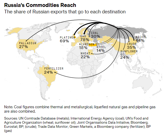 Here's a map of countries that rely heavily on Russia for all sorts of commodities. Russia earns more than $1 billion a day exporting its oil and gas, much of which goes to Europe