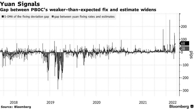China made its biggest push to weaken the yuan through its currency fixings this week as virus-related curbs and rising commodity prices threatened to slow the economy
