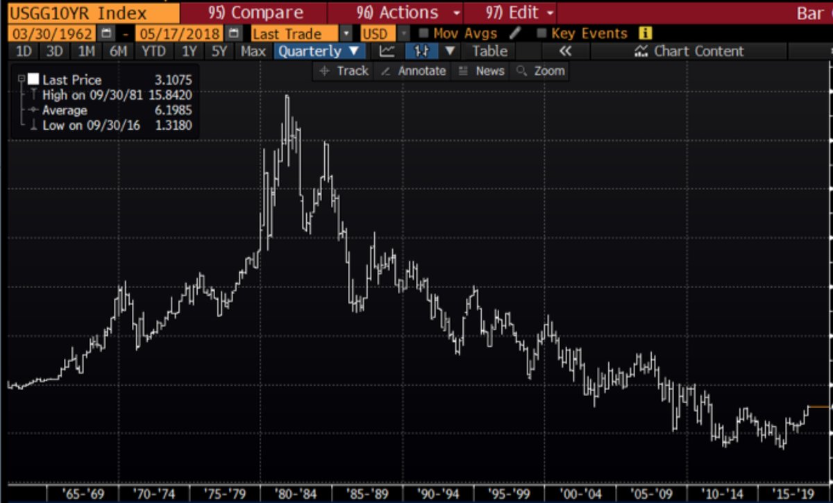 The 10-Year Treasury Yield since the early 1960s. It's currently at about 3.1%. It would have to rise another 355% to take out its 14% highs in 1982